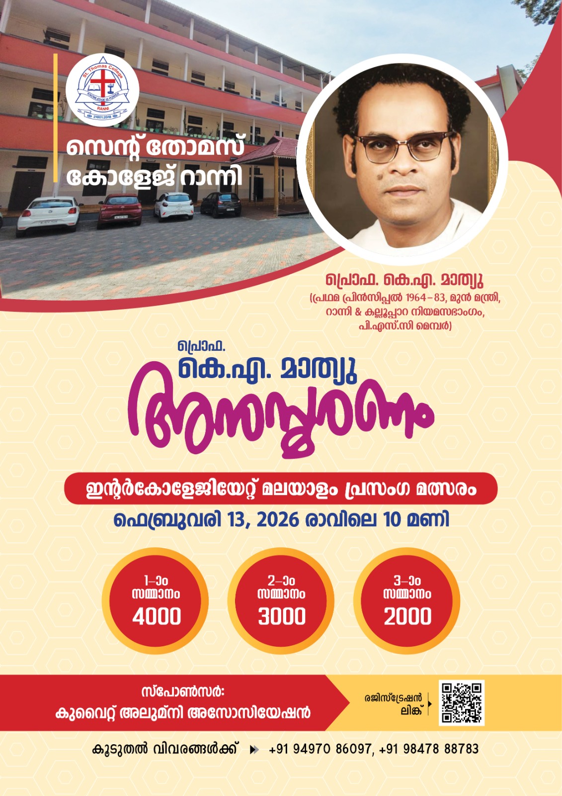 റാന്നി: സെന്റ് തോമസ് കോളേജ് കുവൈറ്റ് അലുമ്നി അസോസിയേഷന്റെ ആഭിമുഖ്യത്തിൽ കോളേജിന്റെ പ്രഥമ പ്രിൻസിപ്പലായിരുന്ന പ്രൊഫ. കെ.എ. മാത്യു അനുസ്മരണവും ഇന്റർ കോളേജിയേറ്റ് മലയാളം പ്രസംഗമത്സരവും ഫെബ്രുവരി 13 വെള്ളി രാവിലെ 10 മണിക്ക് കോളേജ് റൂസ സെമിനാർ ഹാളിൽ വെച്ച് നടത്തപ്പെടുന്നു.